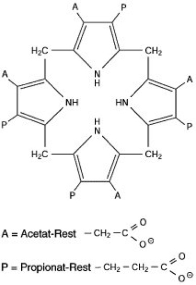 Uroporphyrinogen IIIs, Zwischenprodukt des Porphyrinstoffwechsels ( vgl. Abb. ). Es entsteht unter Katalyse der Uroporphyrinogen-III-Synthase und der Uroporphyrinogen-III-Cosynthase durch Cyclisierung des linearen Tetrapyrrols und anschließende Isomerisierung. In weiteren Reaktionen, bei denen der Sättigungsgrad und die Seitenketten des Porphyrinrings verändert werden, wird Uroporphyrinogen III zu Protoporphyrin IX und schließlich zu Häm umgebaut. Porphyrine, Uroporphyrinogen I.