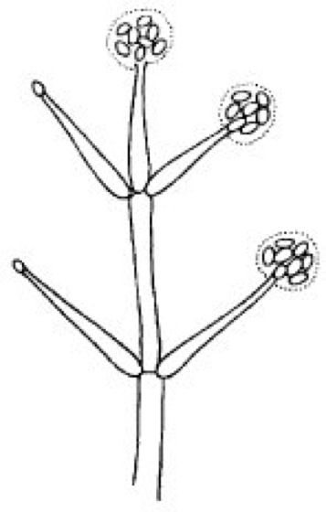 Konidienträger, wirtelig verzweigt, mit Konidien in Schleimtröpfchen