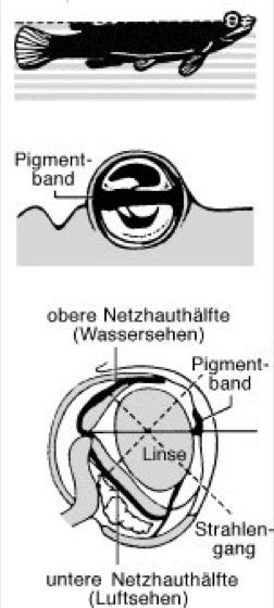 a Vierauge (Anableps spec.) in normaler Stellung an der Wasseroberfläche, b vergrößertes Auge mit dem auch äußerlich durch ein schwarzes Pigmentband geteilten Auge, c Schnitt durch das doppelsichtige Auge