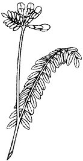 Vogelfuß, Ornithopus, Gattung der Hülsenfrüchtler; zottig behaarte Kräuter mit 3–4 Blüten in Dolden und ungestielten Gliederhülsen (Fruchtstand ähnelt einem Vogelfuß). Die Mäusewicke (Ornithopus perpusillus) ist ein bis 30 cm hohes, niederliegendes Kraut; weißliche Blüten mit gelben Schiffchen; auf Sandböden Westeuropas. Im südwestlichen Europa kommt Serradella (Ornithopus sativus; ß vgl. Abb. ) vor; bis 60 cm hoch, lange Pfahlwurzel, blaßrosa Blüten; gute Futterpflanze, in Nordafrika und Südeuropa als Zwischenfrucht angebaut.