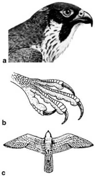 Wanderfalke, Falco peregrinus, 38–48 cm großer Greifvogel ( vgl. Abb. ) der Familie Falken mit schiefergrauer Oberseite sowie breitem, schwarzem Bartstreif; bewohnt bewaldete Gebiete mit Felsen als Brutplätze, doch sind auch bereits Bruten in (Groß-)Städten und an technischen Großbauwerken (Brücken, Masten, Kamine) bekannt geworden. Der Wanderfalke jagt im Flug Vögel bis Krähengröße; er brütet in allen Erdteilen. Vor allem in Nordamerika und Europa zeitweise mit starkem Bestandsrückgang. In Deutschland zeigen intensive Schutzmaßnahmen – vor allem Horstbewachungen – Erfolge, so daß z.B. in Baden-Württemberg wieder ca. 300 Brutpaare heimisch geworden sind; daher erfolgt die Einstufung in die Rote Liste nur noch in die Kategorie „gefährdet“. Trotzdem spielen als Bedrohungsursachen weiterhin Verfolgungen durch den Menschen (Taubenzüchter, Jäger) und gebietsweise Pestizide und Schwermetalle eine Rolle. Flugbild (Abb.), Sakerfalke; Aussterben II , Europa IX , ö Greifvögel I .