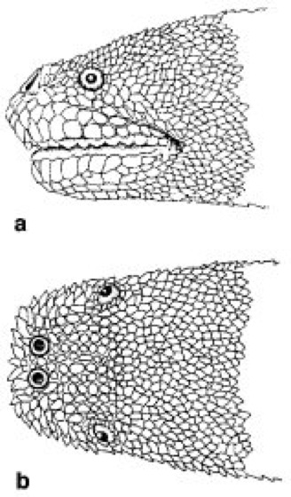 Javanische Warzenschlange (Acrochordus javanicus), Kopfregion in a Seiten-, b Rückenansicht
