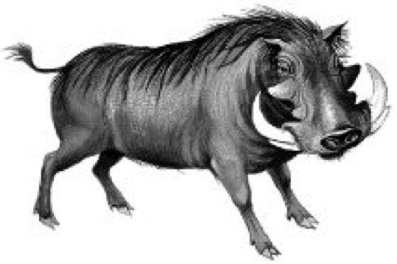 Warzenschweine, Phacochoerus, Gattung der Altweltlichen Schweine mit rezent nur 1 (nach bisheriger Annahme), in 7 Unterarten über Afrika südlich der Sahara verbreiteten Art: Phacochoerus aethiopicus ( vgl. Abb. und Afrika III ); Kopfrumpflänge 1,2–1,6 m, Schulterhöhe 75 cm; großer Kopf mit 2 Paar, bei Männchen zapfenartigen Hautwarzen zwischen Auge und den hauerförmigen Eckzähnen; Nacken- und Rückenmähne, sonst nur spärlich beborstet. Warzenschweine bevorzugen Wassernähe in der offenen Savanne. Sie leben in Familienverbänden und sind vorwiegend tagaktivon Zur Aufnahme der Nahrung (vor allem Gräser und Kräuter) knien Warzenschweine auf Hornschwielen der Handgelenke. Ihre Hauptfeinde sind Löwe und Leopard. Beim Fliehen tragen Warzenschweine den dünnen Schwanz mit Endquaste deutlich sichtbar senkrecht nach oben. Eine zweite Art, das aus Südafrika bekannte Wüstenwarzenschwein, gilt seit etwa 1860 als ausgestorben. Neuerdings gibt es jedoch Berichte, die auf eine „Wiederentdeckung“ dieser Art in Äthiopien hindeuten.