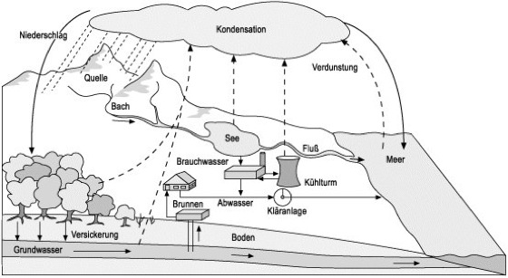 Abb. 1: Schema des globalen Wasserkreislaufs unter Berücksichtigung der Wassernutzung durch den Menschen. Je nach Sonneneinstrahlung, Wind, Oberflächenstruktur der Erde und Jahreszeiten unterscheidet sich die Intensität der einzelnen Vorgänge des Kreislaufs in unterschiedlichen Regionen der Erde. Der Mensch entnimmt aus Grund- und Oberflächengewässern Trink- und Brauchwasser und führt das Abwasser mehr oder weniger gereinigt dem Kreislauf wieder zu.