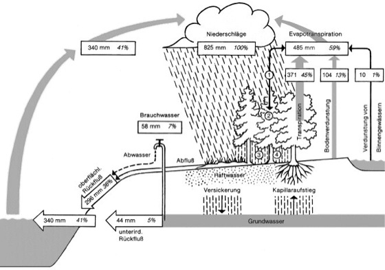 Abb. 2: Schema eines Wasserkreislaufs am Beispiel des Gebietswasserhaushalts der Bundesrepublik Deutschland für die Jahre 1931 bis 1960 (durchschnittliche Jahresmengen). 1: Interzeptionsverdunstung, 2: Interzeptionsaufsaugung, 3: Kronendurchlaß, 4: Stammablauf
