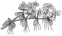 Wassersterngewächse, Callitrichaceae, fast weltweit verbreitete, vorwiegend jedoch in der gemäßigten Zone heimische Familie der Lippenblütlerartigen (nach der neueren Systematik der Braunwurzartigen) mit der einzigen, etwa 25 Arten umfassenden Gattung Wasserstern (Callitriche). Ein- bis mehrjährige, untergetaucht oder amphibisch lebende Pflanzen, die in Anpassung an ihre äußeren Lebensbedingungen sehr wandlungsfähig sind. Hierzu gehört, daß alle Knoten der flutenden bzw. am Boden kriechenden Sproßachse Wurzeln und Seitentriebe ausbilden können und daß aus dem Wasser herausragende Sproßspitzen durch Stauchung der Internodien zu schwimmenden Blattrosetten werden. Zwischen untergetauchten und an der Luft befindlichen Blättern ist ein deutlicher Unterschied festzustellen. Erstere sind in der Regel wesentlich schmaler und dünner, wodurch sie zart und durchsichtig erscheinen. Über sie und die untergetauchten Sprosse wird ein großer Teil der Nährstoffe aufgenommen, da sowohl Wurzel- als auch Gefäßsystem der Wassersterngewächse nur schwach entwickelt sind. Die kleinen, unscheinbaren, einzeln oder zu mehreren in den Blattachseln stehenden Blüten werden durch Wind oder Wasser bestäubt (Anemogamie bzw. Hydrogamie). Sie besitzen keine Blütenhülle, sondern werden lediglich von 2 hinfälligen Vorblättern umgeben. Staminate Blüten bestehen aus einem Staubblatt, karpellate aus einem aus 2 Fruchtblättern zusammengesetzten, 4fächerigen Fruchtknoten. Die Frucht zerfällt in 4 geflügelte oder gekielte Teilfrüchte. Häufigste einheimische Art ist der in stehenden oder fließenden Gewässern bzw. an trocken gefallenen Schlammufern anzutreffende Teich-Wasserstern (Callitriche stagnalis; ä vgl. Abb. ).