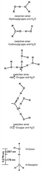 Die Wasserstoffbrücke ist eine nicht kovalente Bindung zwischen einem Protonen-Donor X–H und den freien Elektronenpaaren anderer Atome Y (Protonen-Akzeptor), wobei X und Y stark elektronegative Elemente wie Fluor, Sauerstoff oder Stickstoff sein müssen. In abgeschwächter Form können auch Chlor und Schwefel Wasserstoffbrücken eingehen. Die Bindungsenergie von Wasserstoffbrücken liegt meist zwischen derjenigen einer echten kovalenten Bindung und der Energie einer van-der-Waals-Wechselwirkung (schwache Wechselwirkungen). Ähnlich verhält es sich mit den Bindungslängen. In biologischen Systemen ist der H-Donor ein Sauerstoff- oder ein Stickstoff-Atom mit kovalent gebundenem Wasserstoff, und als H-Akzeptoren fungieren ebenfalls ein Sauerstoff- oder Stickstoffatom. Wasserstoffbrücken sind gerichtet und erreichen maximale Stärke, wenn Donor- und Akzeptor- und das H-Atom auf einer Linie liegen. Die Abb. zeigen einige elementare Wasserstoffbrücken.