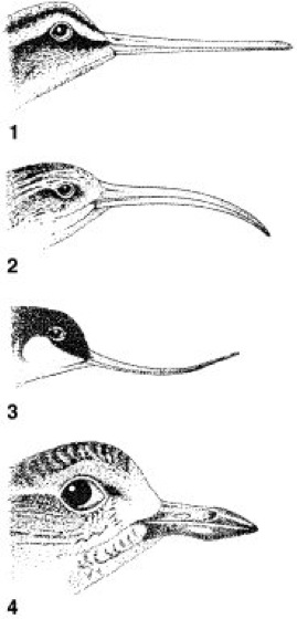 Kopf- und Schnabelformen von Vertretern der 1 Bekassinen (Gallinago), 2 Brachvögel (Numenius), 3 Säbelschnäbler (Recurvirostra), 4 Regenpfeifer (Pluvialis)