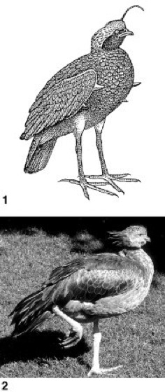 1 Hornwehrvogel (Anhima cornuta),2 Halsbandtschaja, Schopfwehrvogel (Chauna torquata)