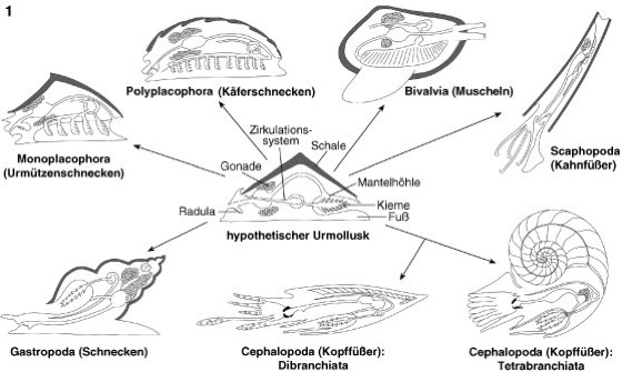 Abb. 1: Baupläne wichtiger Molluskenklassen in vermuteter