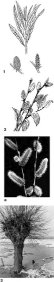 1 Korb-Weide (Salix viminalis) mit Kätzchen (links ♀, rechts ♂); 2 Sal-Weide (Salix caprea), a Kätzchen; 3 Kopf-Weide