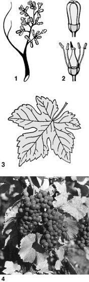 1 Blütenstand; 2 einzelne Blüte, geschlossen und entfaltet (nach Abwurf der Haube); 3 Blatt, 4 Fruchtstand („Weintrauben“)