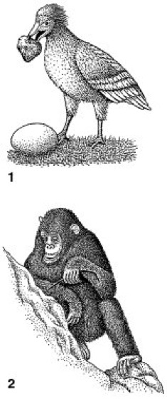 1 Schmutzgeier (Neophron percnopterus), im Begriff, einen Stein auf ein Straußenei fallenzulassen, um dessen Schale zu zerbrechen. 2 Schimpanse beim „Termitenangeln“ mit einem Stock