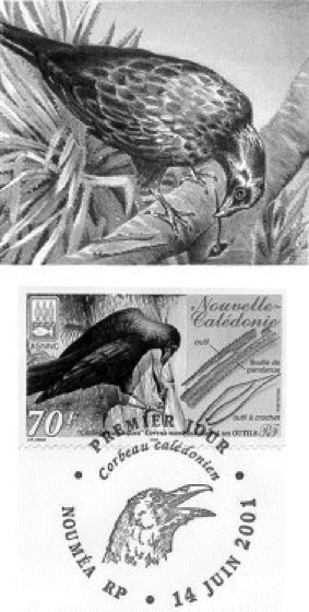 Abb. 2: Die Neukaledonische Krähe (Corvus moneduloides) verfertigt aus den bestachelten Rändern der Blätter einer Schraubenpalme regelmäßig geformte Werkzeuge, mit denen sie Beutetiere aus Baumhöhlen und -spalten herausangelt (Abb. unten: Darstellung auf einer Briefmarke [Ersttagsbrief]), wobei eindeutig die linken Ränder der Blätter bevorzugt werden, unabhängig vom Spiralisierungssinn der Blätter („Händigkeit“). Die Anfertigung gekrümmter Haken aus Draht im Experiment zeigt eine Einsicht in Kausalzusammenhänge.