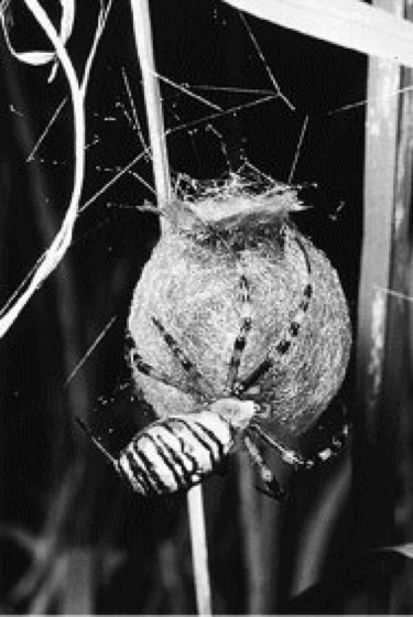Wespenspinne bei der Fertigstellung ihres Eikokons