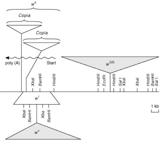 Restriktionskarte des white-Locus von Drosophila mit Angabe einiger inserierter beweglicher Elemente, die zu Augenfarben-Mutationen führen. Die Transkriptionsstartstelle und die poly(A)-Stelle des white-Locus sind mit einer Wellenlinie markiert, die Insertionen sind als Keile dargestellt. Der mit wi (englisch: ivory, elfenbeinfarbig) gekennzeichnete Keil repräsentiert eine Mutante, die nahezu keine Augenpigmente bildet. Diese Mutation wird durch eine 3 kb lange, in einer Tandemwiederholung angeordnete Sequenz verursacht, deren repetitiver Charakter sich durch die wiederholten Schnittstellen von Restriktionsenzymen offenbart (XbaI, BamHI). Aus der Insertion eines 10 kb langen beweglichen Elements innerhalb der duplizierten wi-Region resultiert die Mutante wc mit blaßroten Augen. Das derart mutierte Gen erlaubt die Augenpigmentbildung in geringem Umfang, da die auf eine DNA-Duplikation zurückgehende wi-Umordnung teilweise wieder aufgehoben wird. Durch die Insertion zweier copia-Elemente entstehen schließlich wa-Mutanten, die geringfügig hellere Augen als die wc-Mutante besitzen. Auch bei der wDZL-Mutante, die durch die Insertion eines langen repetitiven Elements „stromaufwärts“ (upstream) von der Startstelle des white-Locus entstanden ist, liegt eine blasse Augenfarbe vor.