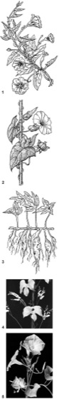 1 Ackerwinde (Convolvulus arvensis);2 Zaunwinde (Calystegia sepium), blühender und fruchtender Sproß; 3 Süßkartoffel (Ipomoea batatas), beblätterter Sproß mit Wurzelknollen; 4 die Zierpflanze Ipomoea lobata aus dem tropischen Amerika hat tiefgelappte Blätter und röhrenartige, zweilippige, in gegabelter Traube stehende Blüten; 5 Purpurprunkwinde (Ipomoea purpurea)