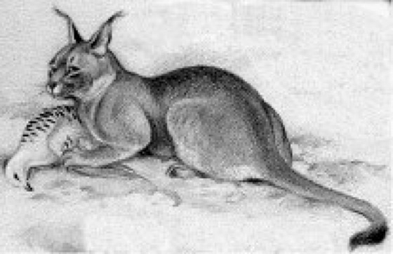 Wüstenluchs, Karakal, Caracal (= Felis) caracal, den Luchsen der Gattung Lynx nahestehende, schlanke und hochbeinige Kleinkatze der afrikanischen Savannen und der asiatischen Sandwüsten und Steppen. Kopfrumpflänge 55–75 cm, Schwanzlänge 22–33 cm. Wüstenluchse ( ü vgl. Abb. ) jagen hauptsächlich in den Morgen- und Abendstunden nach kleineren Wirbeltieren. In Indien hat man Wüstenluchse früher auch zur Jagd abgerichtet (Gepard).