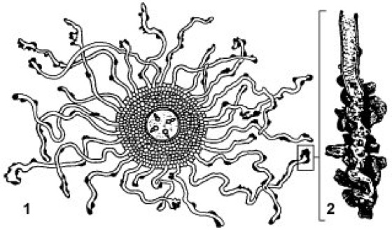 Die Abb. zeigt (1) einen Querschnitt durch die Resorptionszone einer Wurzel und (2) die vergrößerte Spitze eines Wurzelhaars mit anhängenden Bodenpartikeln.
