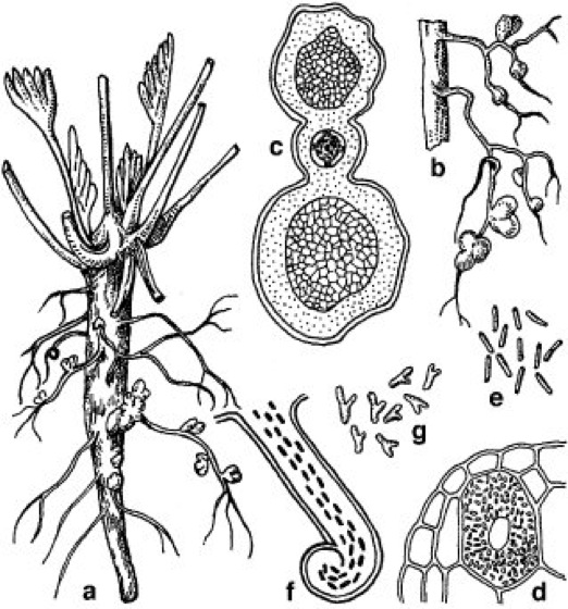 Hülsenfrüchte als Stickstoffsammler: a Wurzel der Esparsette mit Wurzelknöllchen, b Knöllchen in etwas größerer Darstellung, c Wurzel- und Knöllchenquerschnitt, d Knöllchengewebe mit einer vergrößerten, bakteriengefüllten Zelle, e normale Knöllchenbakterien, f Eindringen der Bakterien in ein Wurzelhaar, g umgestaltete Bakterien eines Knöllchens