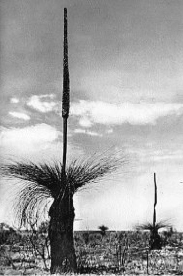 Australischer Grasbaum (Xanthorrhoea spec.). Die wie gestielte Kerzen den Blattschöpfen entsteigenden Blütenstände erreichen mit ca. 2 m Länge beinahe die Höhe der Pflanze selbst.