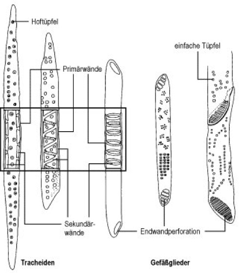 Schematische Darstellung der Zelltypen des Xylems. Sowohl Tracheiden als auch Gefäßglieder (Tracheen) zeichnen sich durch starke Verdickungen ihrer sekundären Zellwände aus (siehe Kasten). Die Wände der Gefäßglieder sind an den Enden offen.