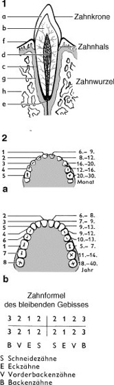 1 Längsschnitt durch einen Schneidezahn; a Zahnschmelz, b Zahnbein, c Zementschicht, d Zahnmark, e Wurzelloch, f Zahnfleisch, g Wurzelhaut, h Kieferknochen. 2 Anordnung der Zähne im Oberkiefer des Menschen und die Reihenfolge des Zahndurchbruchs: a der Milchzähne, b der bleibenden Zähne; die rechts stehenden Zahlen geben die Zeiten des Durchbruchs, die links stehenden die Reihenfolge an.