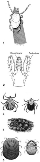 1 Zecke in typischer Lauerstellung. 2 Gnathosoma des Holzbocks (Ixodes ricinus); unter dem Hypopharynx liegen die Cheliceren; 3 Männchen und Weibchen der Gattung Dermacentor; die in Süddeutschland vor allem an Schafen vorkommende, 3 mm große Art Dermacentor marginatus überträgt Coxiella burnetii (Erreger des Q-Fiebers). 4 Schildzecken auf der Haut. 5 Die in Afrika vorkommende Art Ornithodorus moubata (vollgesogenes Weibchen und Männchen von unten) überträgt Spirochäten (Zeckenrückfallfieber).