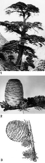 1 Atlas-Zeder (Cedrus atlantica);2 Zweig der Himalaya- oder Deodara-Zeder (Cedrus deodara),3 der Libanon-Zeder (Cedrus libani) mit Zapfen