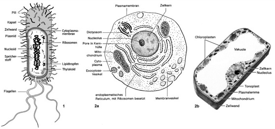 Die pflanzliche Zelle (2b) unterscheidet sich von der tierischen Zelle (2a) durch den zusätzlichen Besitz von Plastiden, eines Vakuolensystems und der festen Zellwand.