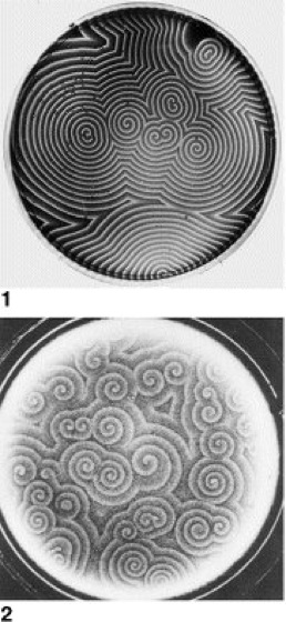 Wellenfronten 1 des Zhabotinsky-Belousov-Reagens, 2 von aus einer (in einer Petri-Schale ausgebreiteten) einlagigen Zellschicht des Schleimpilzes Dictyostelium discoideum soeben freigesetztem cAMP. Die Ähnlichkeiten der Muster sind unverkennbar. Auch die räumliche und zeitliche Organisation der beiden Reaktionen läuft in ähnlicher Weise ab.