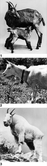 1 Alpenziege mit Jungen, 2 Saanenziege (hornlos); 3 zu den Gemsenverwandten gehörende Schneeziege (Oreamnos americanus)