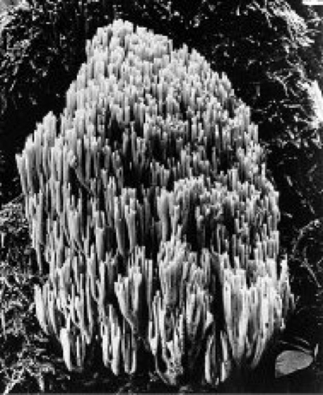 Ziegenbärte, „Korallen“, Ramaria, Gattung der Nichtblätterpilze (Aphyllophorales, Familie Gomphaceae, früher Ramariaceae); weltweit etwa 100, in Europa ca. 40 Arten ( ä vgl. Tab. ), deren Fruchtkörper aufrecht verzweigt ist; die Äste sind hell, oft lebhaft, auch dunkel gefärbt und nicht abgeflacht. Das Sporenpulver ist gelblich bis bräunlich; die ellipsoiden Sporen besitzen eine rauhe, feinwarzige bis stachelige Oberfläche. Ziegenbärte ( ä vgl. Abb. ) wachsen auf Erdboden und Humus, seltener auf Holz.