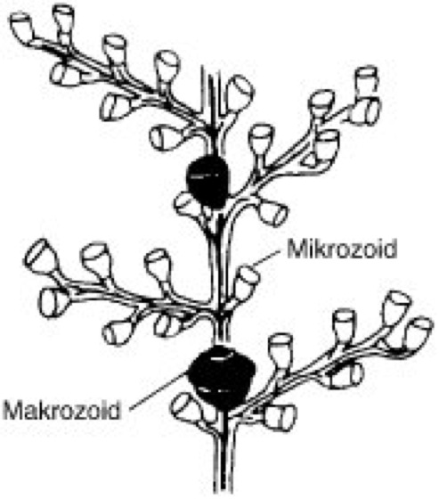 Zoothamniums [von *zoo- , griech. thamnion = kleiner Strauch], Gattung der Peritricha; Wimpertierchen mit mehrere mm großen Stöcken (Tierstöcke), im Meer und Süßwasser verbreitet. Alle Einzelzellen haben einen gemeinsamen Stielmuskel. Bei Zoothamnium liegt eine Differenzierung der Individuen in Mikrozoide und viel größere Makrozoide vor ( vgl. Abb. ). Letztere haben ein reduziertes Peristom, und nur sie können sich ablösen und eine neue Kolonie gründen.