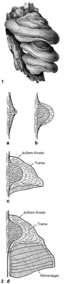 1 Fruchtkörper. 2 Entwicklung des Fruchtkörpers (Querschnitte); a, b Initialfruchtkörper, c junger Fruchtkörper, d mehrjähriger Fruchtkörper
