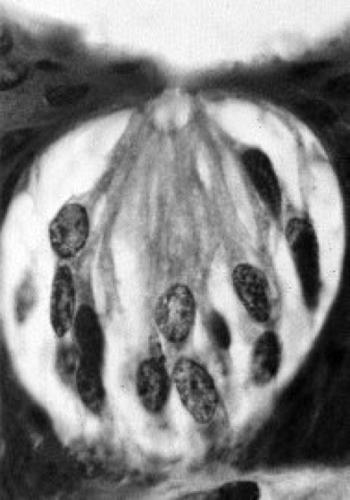 Abb. 1: Die Zunge des Menschen trägt über 200 Geschmacksknospen, die in kleinen Erhöhungen, den Papillen, besonders an der Oberseite der Zunge liegen. Auch an anderen Stellen in der Mundhöhle sind sie verstreut anzutreffen. Von den Nervenbündeln in den Geschmacksknospen werden Impulse auf Nervenfasern zum verlängerten Mark (Medulla oblongata), zur Brücke (Pons) und bis zum Geschmackszentrum in der Hirnrinde geleitet.