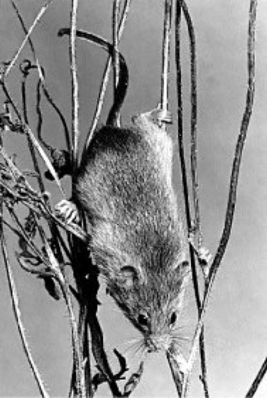 Zwergmaus, Hafermaus, Micromys minutus, über ganz Eurasien (außer im äußersten Norden und Süden) verbreitete kleine Maus (Kopfrumpflänge 5,5–7,5 cm; Schwanzlänge 5–7 cm), die geschickt zwischen den Halmen hochwüchsiger Gräser (Getreide, Reis, Schilfrohr) herumklettert ( vgl. Abb. ) und darin ein kugelförmiges Grasnest anlegt. Nagetiere .