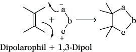 1,3-dipolare Cycloaddition, eine synchrone cis-Addition eines 1,3-Dipolmoleküls an die Mehrfachbindung eines Dipolarophils, z. B. Alkene, Alkine, Nitrile, unter Bildung eines heterocyclischen Fünfringes: