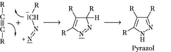Eine von zahlreichen bekannten Ringschlußreaktionen ist die Umsetzung von Diazoalkanen mit Alkinen zu Pyrazolen: