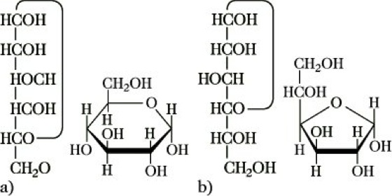 Monosaccharide. Abb. 2: α-D-Glucopyranose (a) und α-D-Glucofuranose (b), jeweils nach Fischer (links) und nach Haworth (rechts) dargestellt.