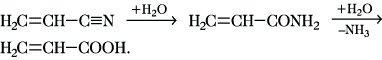 Acrylnitril, Vinylcyanid, Acrylsäurenitril, CH2=CH-C≡N, eine farblose Flüssigkeit mit stechendem Geruch; F. -83,5 °C, Kp. 77,5 °C, nD20 1,3911. A. ist in Wasser wenig, in den meisten organischen Lösungsmitteln gut löslich. Aufgrund der Anwesenheit der aktivierten C=C-Doppelbindung und der Nitrilgruppe -C≡N erweist sich A. als außerordentlich reaktiv. Es polymerisiert sehr leicht unter Bildung von Polyacrylnitril. In Gegenwart von Polymerisationsinhibitoren, z. B. Hydrochinon oder Brenzcatechin, kann A. längere Zeit gelagert werden. Im Sinne der Michael-Addition können z. B. CH-acide Verbindungen an die C=C-Doppelbindung unter Bildung cyanethylierter Derivate addiert werden: R-H + CH2=CH-C≡N → R-CH2-CH2-C≡N. Durch Einwirkung wäßriger Mineralsäuren kann A. hydrolytisch in Acrylsäureamid oder in Acrylsäure umgewandelt werden: