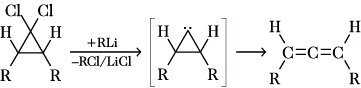 2) Cyclopropyliden-Allen-Umlagerung. Durch Einwirkung von Lithiumalkylen auf 1,1-Dichlorcyclopropane erfolgt Öffnung des dreigliedrigen Ringes, wobei die Reaktion vermutlich über ein Carben als Zwischenstufe läuft: