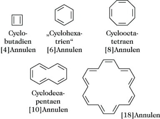 Außerdem besteht die Möglichkeit der systematischen Benennung: Cyclobutadien, Cyclooctatetraen, Cyclodecapentaen usw. Da das "hypothetische" Cyclohexatrien nicht als reale Verbindung existiert, wird es herausgenommen (Benzol). Auch Cyclobutadien und Cyclooctatetraen werden oft gesondert behandelt. Die A. mit 4n π-Elektronen (n = 1, 2, 3, 4 ...) sind antiaromatisch (Aromatizität). Enthält das cyclisch konjugierte System (4n + 2) π-Elektronen wie das Benzol mit n = 1, so ist es aromatisch (Hückel-Regel, vgl. Aromatizität). Das [10]Annulen entspricht hinsichtlich seiner elektronischen Struktur der Hückel-Regel. Es verfügt über 10 π-Elektronen im cyclisch konjugierten Ringsystem, ist jedoch nicht eben gebaut und damit nicht mesomeriestabilisiert, da die beiden H-Atome in 1- und 6-Position einer Einebnung entgegenwirken. Infolge dieser sterischen Mesomeriebehinderung tritt kein für Aromaten typischer diamagnetischer Ringstrom im Magnetfeld auf (1H-Kernresonanzspektroskopie). Auch das [14]Annulen, das nach der Hückel-Regel aromatisch sein sollte, ist aus sterischen Gründen nicht völlig planar und weist keinen diagmagnetischen Ringstrom auf. Erst beim [18]Annulen sind alle Bedingungen für eine aromatische Verbindung gegeben. Neben (4n + 2) π-Elektronen (n = 4) ist es völlig eben und hat eine hohe Molekülgeometrie. Im Magnetfeld des Kernresonanzspektrometers wird deshalb ein diamagnetischer Ringstrom induziert, der bewirkt, daß alle peripheren gleichberechtigten Protonen nur ein Signal mit entsprechender Tieffeldverschiebung geben (δ = 8,8 ppm). [18]Annulen ist durch Stabilität und hohe Bildungstendenz gekennzeichnet. Es gehört zu den nichtbenzoiden Aromaten.