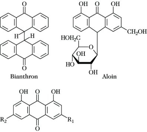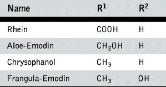 Anthraglycoside, glycosidisch mit Zuckerresten verbundene hydroxylierte Derivate des Anthrachinons und seiner partiell reduzierten Verbindungen, wie Anthranole, Anthrone und Bianthrone. Die wichtigsten Aglykone vom Anthrachinontyp, die als Emodine bezeichnet werden, sind Rhein, Aloe-Emodin, Chrysophanol und Frangula-Emodin. Entsprechend substituierte Aglykone sind auch vom Anthron- und vom Bianthrontyp bekannt, wobei bei den Verbindungen vom dimeren Bianthrontyp zwei gleiche oder zwei verschiedene Substitutionsmuster in einem Molekül vorliegen können.