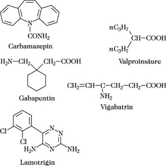 Antikonvulsiva, Antiepileptika, Verbindungen, die das Auftreten zentral bedingter Krämpfe verhindern oder deren Intensität herabsetzen. Bei epileptischen Anfällen unterscheidet man zwischen dem mit tonischen und klonischen Krämpfen einhergehenden Anfall (Grand mal) und dem "kleinen Anfall" ohne generalisierte Krämpfe (Petit mal). Wichtige A. finden sich unter anderem in den Stoffklassen der Barbitale, der Hydantoine und der Succinimide (Ethosuximid). Ein wichtiges A. ist das Carbamazepin. Auch das stickstofffreie Valeriansäurederivat Valproinsäure ist in Gebrauch. Von der Tatsache ausgehend, daß γ-Aminobuttersäure (GABA) als natürlicher dämpfender Transmitter auftritt, sind stabilere Strukturverwandte von A., wie Vigabatrin und Gabapentin entwickelt worden. Ein Triazinderivat ist Lamotrigin, ein Glutaminsäureantagonist.