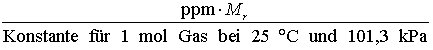 Die Begrenzung der Zulässigkeit von Arbeiten in schadstoffbelasteter Luft ist gegeben durch die maximale A., Abk. MAK, im Englischen bezeichnet als MAC, Abk. von maximal acceptable (allowable, admissible) concentration. Die MAK sollte in mg/m3 angegeben werden. Die A. eines Gases oder Dampfes läßt sich ferner in Vol.-% angeben. Werden z. B. 100 cm3 Kohlenmonoxid in 1 m3 Luft gleichmäßig verteilt, so liegt eine Endkonzentration von 100 ppm CO vor (entspricht 0,01 Vol.-%). Endkonzentration ist derjenige Gehalt an Wirkstoff oder Schadstoff, der nach Mischung, Lösung oder Verteilung im Vehikel oder Medium vorliegt. Durch eine Umrechnung, bei der die relative Molekülmasse Mr und das Molvolumen V bezogen auf 25 °C und 101,3 kPa (= 760 Torr) berücksichtigt werden müssen, läßt sich der Raumluftgehalt des betreffenden Schadstoffes nach folgender Formel in mg/m3 errechnen: