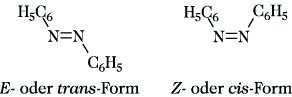 Azobenzol, die einfachste aromatische Azoverbindung. A. existiert in zwei stereoisomeren Formen. Das stabile A. liegt in der E-Form vor. Es kristallisiert in roten Blättchen; F. 68 °C. Bei der UV-Bestrahlung einer Lösung des (E)-A. stellt sich ein Gleichgewicht zwischen der E- und der Z-Form ein. Aus dem Isomerengemisch kann das (Z)-A. chromatographisch abgetrennt werden; F. 71,4 °C, Kp. 297 °C (E- und Z-Form). A. ist in Wasser schwer löslich, in heißem Alkohol und Ether löst es sich leicht. Es ist giftig und wirkt in größeren Mengen wie Nitrobenzol. Bei der Einwirkung von Reduktionsmitteln auf A. werden Hydrazobenzol bzw. Anilin gebildet. Mit Peressigsäure wird es zu Azoxybenzol oxidiert. Man erhält A. durch Reduktion von Nitrobenzol, durch Oxidation von Hydrazobenzol oder durch Kondensation von Nitrosobenzol mit Anilin. A. wird zur Herstellung von Farbstoffen verwendet.