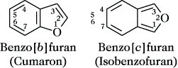 Benzofurane, das kondensierte Ringsystem des Benzols und des Furans enthaltende heterocyclische Verbindung. Man unterscheidet Benzo[b]furan (Cumaron) und Benzo[c]furan (Isobenzofuran).