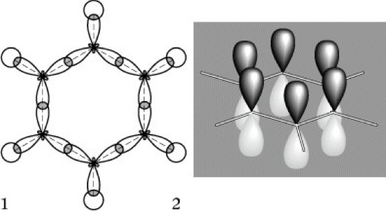Das theoretische Verständnis des energiearmen, aromatischen Zustands des B. (Energiegewinn gegenüber dem nicht existierenden "Cyclohexatrien" von 150 kJ·mol-1), Aromatizität, kann durch mehrere Modelle unterstützt werden. Abb. 1 zeigt, daß alle sechs sp2-hybridisierten C-Atome und die sechs H-Atome in einer σ-Bindungsebene mit gleichen Bindungsabständen C-C und C-H liegen, d. h. eine hohe Symmetrie vorliegt. Abb. 2 zeigt die senkrecht zu dieser Ebene angeordneten π-Orbitale, die im realen Molekül optimal "überlappt" sind.