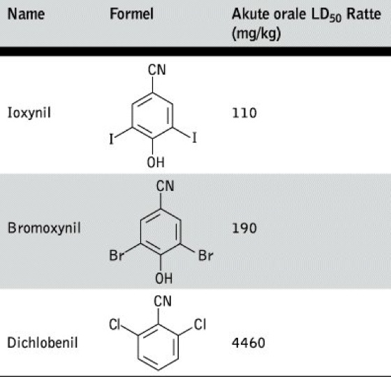 Benzonitrilherbizide. Das einheitliche Strukturelement dieser Wirkstoffgruppe ist das Benzonitril (s. Tab.). Die Hauptwirkung der Benzonitrile mit einer p-Hydroxygruppe besteht in einer Entkopplung der oxidativen Phosphorylierung, wobei die Aufnahme der Wirkstoffe bevorzugt über die Blattaufnahme im Nachauflauf erfolgt.